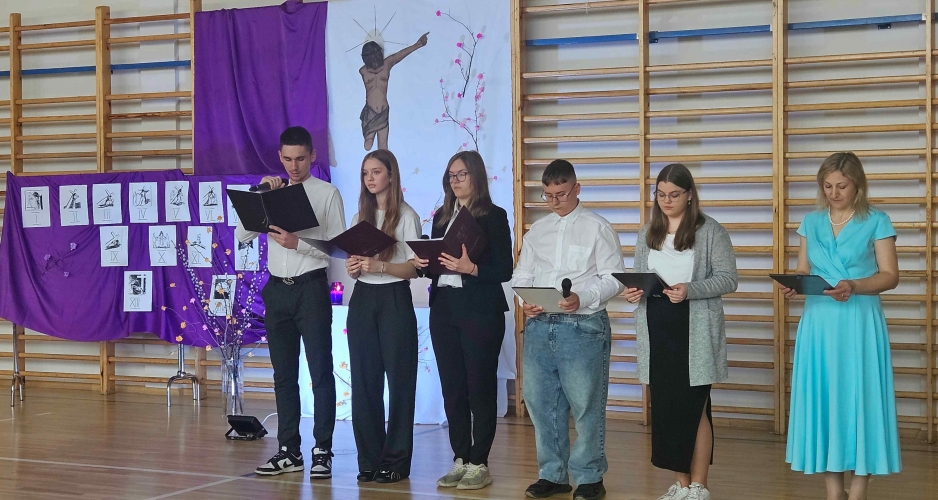 1 kwietnia 2026 r. w naszej szkole odbył się apel wielkanocny pt. „Mój Chrystus Połamany”. Uczniowie wykonali montaż słowno-muzyczny oparty na historii hiszpańskiego ojca jezuity - Romana Cue Romano. Ta opowieść skłoniła całą społeczność szkolną do refleksji nad wartościami i wprowadziła w świąteczny nastrój.