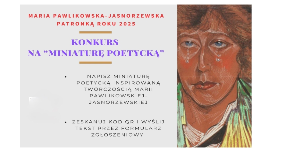 24 listopada przypada rocznica śmierci znanej poetki Marii Pawlikowskiej-Jasnorzewskiej, która jest Patronką Roku 2025. Z tej okazji zapraszamy do udziału w konkursie na „miniaturę poetycką”. Na prace konkursowe czekamy do 25 listopada 2025 r. Szczegóły u p. Justyny Ostrzyżek.