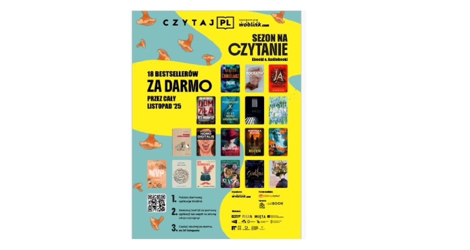 Biblioteka szkolna zachęca do udziału w ogólnopolskiej akcji promującej czytelnictwo Czytaj PL. Aby czytać książki za darmo należy pobrać bezpłatną aplikację Woblink, zeskanować kod QR dostępny na plakacie i można korzystać z książek w postaci ebooka lub audiobooka. Lista książek proponowanych w ramach akcji jest zróżnicowana. Przedsięwzięcie trwa do 30.11.2025 r. Zapraszamy.