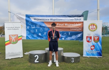 Dnia 16 października w Białej Podlaskiej odbył się Finał Województwa w zawodach lekkoatletycznych. Niezmiernie miło jest nam poinformować, iż Filip Okuń z klasy 2teh stanął na 3 miejscu podium w konkurencji 100 m. Jest to niesamowite osiągnięcie tym bardziej, że czas jaki osiągnął Filip - 11.66 jest nowym rewelacyjnym rekordem szkoły poprawionym po 12 latach - ostatni najlepszy wynik to 12.00. Do srebrnego medalu zabrakło 1 setną sekundy. Naszą szkołę reprezentowali również: Emila Gryczka z klasy 1bc - pchnięcie kulą - 13 miejsce oraz Andreii Lionchuk z klasy 4tżb - pchnięcie kulą - 17 miejsce. Ogromne gratulacje dla naszych reprezentantów.