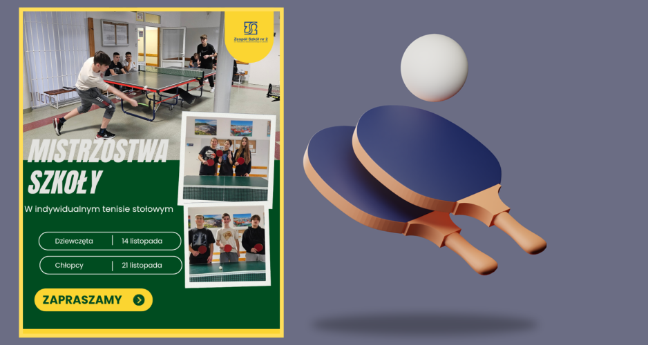 Chcesz zostać Mistrzem lub Mistrzynią Tenisa? To Twoja szansa! Weź udział w Mistrzostwach Zespołu Szkół nr 2 w indywidualnym tenisie stołowym (dziewczęta: 14 listopada, chłopcy: 21 listopada). Do udziału zapraszamy wszystkich uczniów ZS 2 – zarówno początkujących, jak i zaawansowanych graczy. Na zwycięzców czekają nagrody, dyplomy i tytuł Mistrza lub Mistrzyni Szkoły w Tenisie Stołowym 2025! Zgłoszenia przyjmowane są do 13 listopada u nauczyciela wychowania fizycznego - p. Izabeli Opolskiej Nie przegap okazji, by sprawdzić swoje umiejętności, dobrze się bawić i zdobyć tytuł najlepszego i najlepszej!