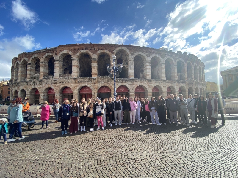 W dniach 4-13 października 2025 roku grupa ponad 40 uczniów naszej szkoły uczestniczyła w niezapomnianej wycieczce zagranicznej do Włoch i Hiszpanii. Podczas dziesięciodniowej podróży, uczniowie mieli okazję zwiedzić najpiękniejsze miejsca południowej Europy, poznając ich historię, kulturę oraz tradycje. Odwiedziliśmy m.in. Veronę słynącą z historii o Romea i Julii. Widzieliśmy m.in. balkon Julii, amfiteatr, a także malownicze ulice starego miasta. Była to doskonała okazja, by wprowadzić się w atmosferę włoskiego romantyzmu.